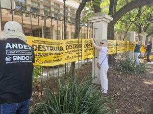 O ANDES/UFRGS se soma a essa mobilização e aos atos que ocorrerão no dia 4 de dezembro, com destaque para o que terá como ponto de concentração a frente da Faced, às 14h. Nele expressaremos nossa posição em defesa dos serviços públicos e da(o)s trabalhadora(es), contra a Reforma Administrativa, e nossa solidariedade com a(o)s colegas TAEs em sua luta pelo cumprimento do seu Acordo de Greve.