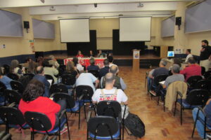 A mesa “A crise ambiental e a classe trabalhadora”, iniciou com a seguinte provocação: “Qual o papel do Sindicato do debate ambiental?”, realizada pela mediadora da mesa, Itiara Veiga, aos professores Paulo Brack (UFRGS) e Carlos Machado (FURG).